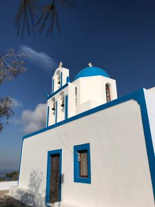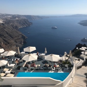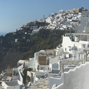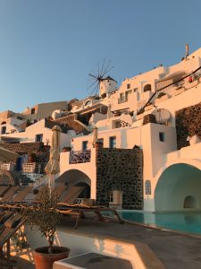Nächster Tag, Abfahrt zum Flughafen und Flug nach Santorini. Dort wohnen wir in den Ampelonas Apartments. Eine tolle Unterkunft im hoch gelegen schönsten Ort der Insel, Imerovigli mit 360 Grad Aussicht zu einem dafür sehr guten Preis-Leistungsverhältnis für Santorini. In direkter Nachbarschaft befinden sich die teuersten Hotels und Restaurants der Insel, von den Touristenströmen der Kreuzfahrtschiffe bekommt man nichts mit.