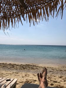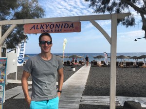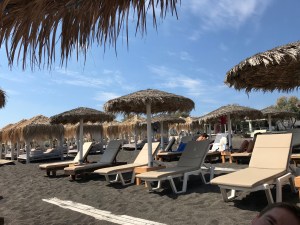 Am letzten Tag machen wir mit dem lokalen Bus ein Ausflug zu den schwarzen Stränden. Wir haben uns am Beach in Perivolos 2 Sonnenliegen mit Schirm in erster Reihe gegönnt, ein Greek Salad, Wasser und Coke für insgesamt schlappe 16 EUR….super!