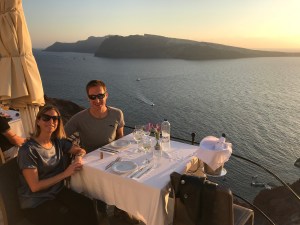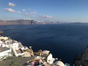 Den nächsten Morgen verbringen wir nach der Joggingrunde und dem tollen Frühstück auf unserer Terrasse am Pool. Nach einem Spaziergang entlang des Kaldera Wegs Richtung Fira mit spektakulären Aussichten, fahren wir nach Oia, dem zweit grössten Ort nach Fira. Der Ort ist sehr nett, allerdings von Touristen überlaufen, was nicht unser Ding ist. Von Freunden bekommen wir den Tipp zum Sundowner ins Restaurant Ombra zu gehen. Die ist abseits der Touristen und echt toll gelegen. Ich würde sagen einer der besten Orte zum Sunset weltweit. Das Essen lies zu wünschen übrig und war viel zu teuer, aber die Location und der Kellner waren genial.