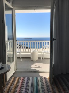 Ankunft auf Mykonos. Fahrt mit dem Taxi zum Hotel Korali in Mykonos Stadt, kostet ca. 15 EUR. Das Hotel ist ein Komplex aus drei 5* Sterne Hotels, man kann alle Pools und Restaurants nutzen bzw besuchen. Die Hotels liegen oberhalb der Altstadt von Mykonos mit schöner Aussicht auf die Stadt mit den berühmten Windmühlen und das Meer. Die gesamte Anlage ist sehr sauber und die Zimmer werden zweimal täglich geputzt. Die Lage ist ebenfalls perfekt, ruhig und doch in Gehweite (ca. 10 min) zur Altstadt.