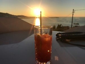 Abends schauen wir uns in einer netten Bar den Sundowner an und essen dann bei einem guten und für Mykonis Stadt preiswerten Italiener D‘Angelo sehr feine Spaghetti Frutti di Mare.