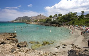 Diese Strände sind die beiden einzigen Sandstrände am steinigen Küstenabschnitt von Alcúdia. Im Hintergrund erhebt sich das Castell de Manresa.
