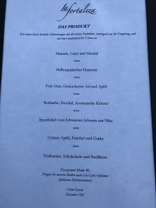 Es gibt eine Auswahl von zwei Degustationsmenüs mit fünf oder sieben Gängen. Auf Wunsch werden die passenden Weine dazu ausgesucht.