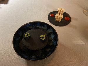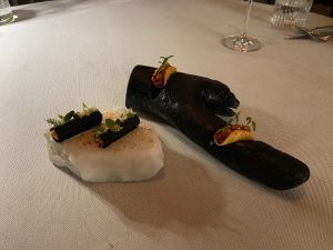 Der Chefkoch selbst serviert das erste Amuse Bouche am Tisch. Auch die sehr gut ausgewählte Weinbegleitung überzeugt uns.