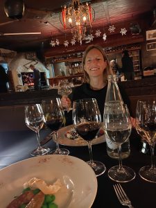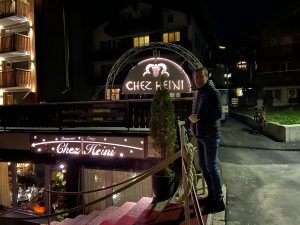 Am Abend zum Dinner gehts in eine ganz spezielle Institution in Zermatt, das Chez Heini. Das Restaurant von Urs Biner ist das Zermatter Kultlokal und wird vor allem am Ende der Woche überrannt, auch vom ein oder anderen Promi. Das Interieur ist stilvoll zusammengewürfelt (Stühle von Heinz Julen, Jagdtrophäen an den Wänden, fürs Haus kreiertes Swarovski-Porzellan), der Service auch bei Grossandrang aufgestellt und witzig. Das grosse Thema im Lokal ist Lamm: Das gibt’s vom Süppchen im Stiletto übers Rippli bis zum Filet. Allerdings mit diversen Alternativen: vom Kalbsbäggli übers mediterrane «Fischpäckli» und Rindsfilet bis zu vegetarischen Tellern. Zu guter Letzt gibt der Gastgeber noch ein Ständchen zum Besten mit Video-Begleitung. Wirklich cool und lustig!